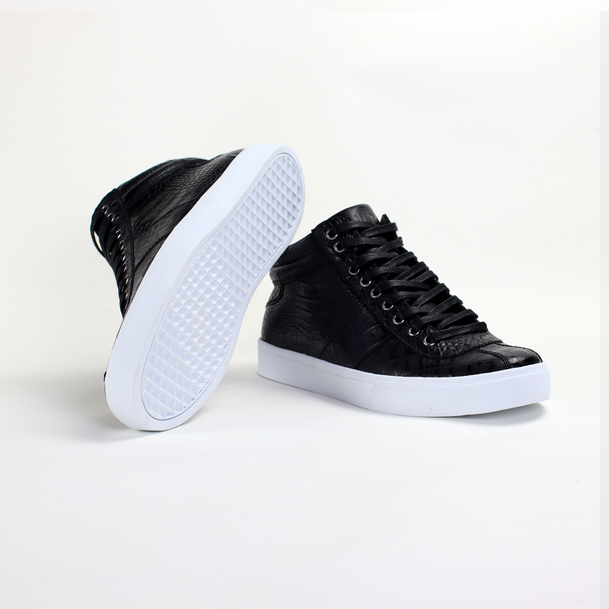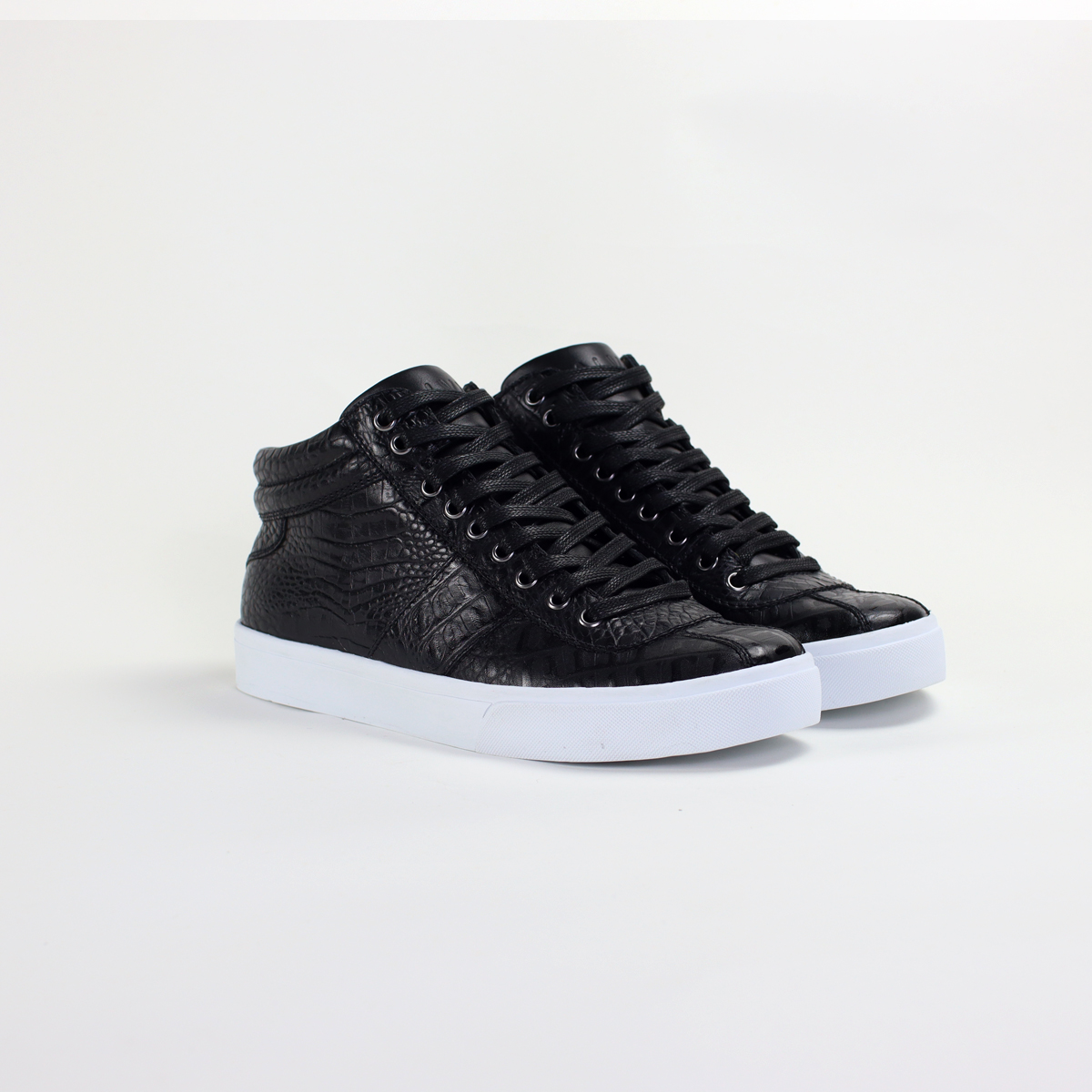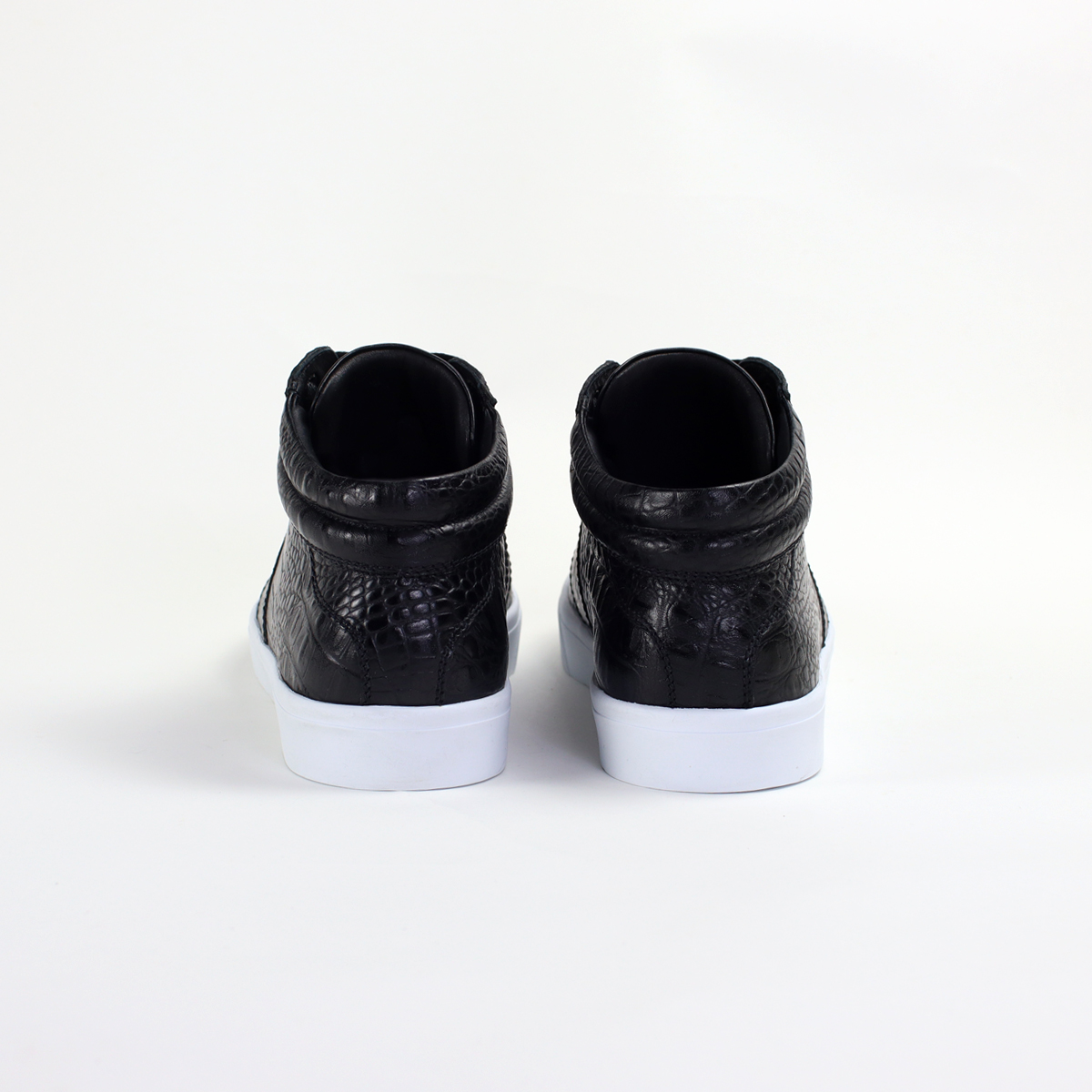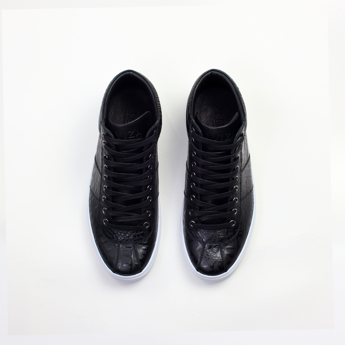 Zapatillas elaboradas de cuero vacuno con diseño alusivo a la piel del cocodrilo, hechos a mano en Perú.